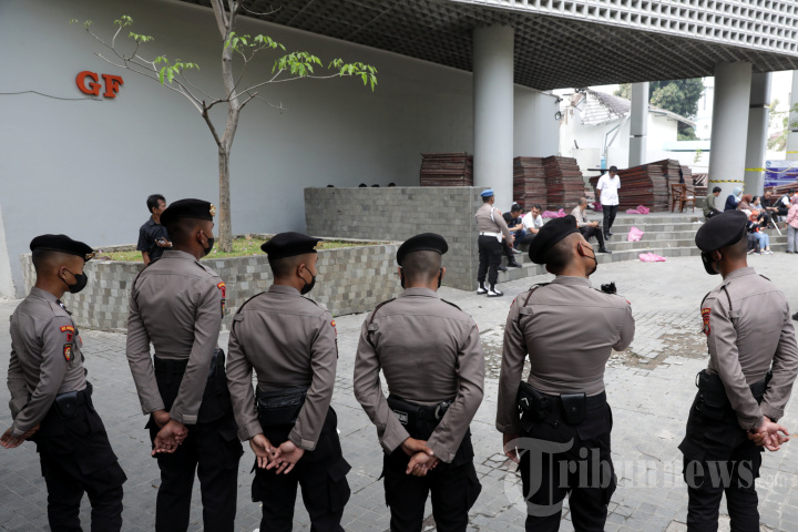 Polisi berjaga di Museum Nasional pasca kebakaran di Jakarta, Minggu (17/9/2023). Museum Nasional masih ditutup untuk umum pasca kebakaran yang melahap Gedung A Museum Nasional yang terjadi pada Sabtu (16/9/2023) malam yang diduga disebabkan oleh korsleting arus listrik dari bedeng proyek renovasi. TRIBUNNEWS/IRWAN RISMAWAN