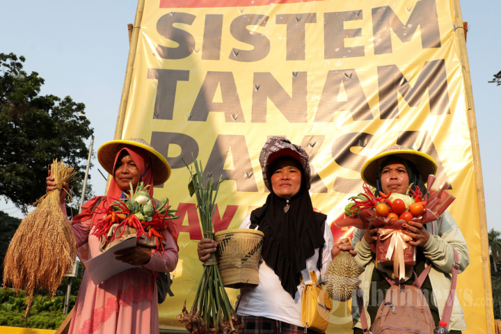 Massa yang tergabung dalam Komisi Nasional Pembaruan Agraria (KNPA) melakukan aksi dalam puncak acara Peringatan Hari Tani Nasional 2023 di kawasan Patung Kuda, Jakarta, Selasa (26/9/2023). Peringatan Hari Tani Nasional 2023 yang dihadiri petani organisasi buruh, organisasi lingkungan, masyarakat adat, dan lain sebagainya itu digelar untuk menuntut pertanggungjawaban pemerintah atas pelaksaan Reformasi Agraria. TRIBUNNEWS/IRWAN RISMAWAN
