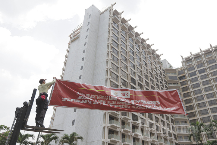 Petugas memasang spanduk pemberitahuan di depan Hotel Sultan, Kompleks GBK, Jakarta, Rabu (4/10/2023). Pusat Pengelolaan Kompleks Gelora Bung Karno (PPKGBK) memasang spanduk pemberitahuan tanah aset negara di Hotel Sultan, dan mengingatkan pengelola hotel itu segera mengosongkan lahan di Blok 15 kawasan GBK. Tribunnews/Jeprima
