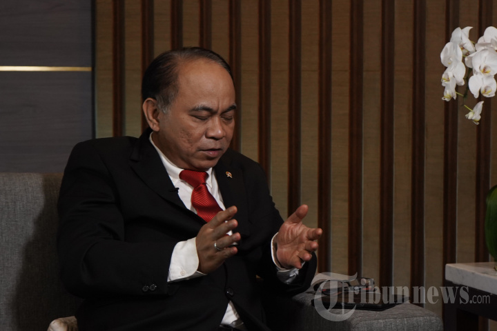 Menteri Komunikasi dan Informatika Budi Arie Setiadi saat wawancara dengan Direktur Pemberitaan Tribun Network Febby Mahendra Putra, di Kantor Kementerian Komunikasi dan Informatika RI, Jakarta Pusat, Kamis (05/10/2023). Keduanya membahas seputar pemberantasan judi online hingga pengoperasian satelit internet Starlink yang rencananya akan dilakukan secara komersil pada tahun 2024 mendatang. TRIBUNNEWS/RIDHO HENDRIKOS