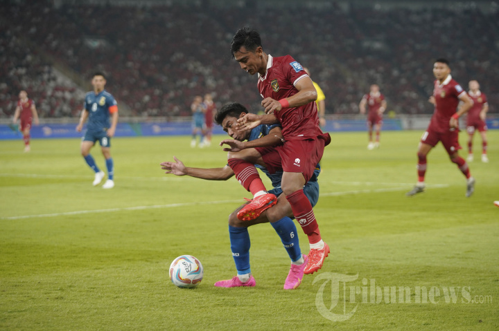 Pesepak bola Timnas Indonesia Pratama Arhan berebut bola dengan pesepak bola Timnas Brunei Darussalam pada pertandingan leg pertama Kualifikasi Piala Dunia 2026 di Stadion Utama Gelora Bung Karno (SUGBK), Jakarta, Kamis (12/10/2023). Timnas Indonesia berhasil mengalahkan Brunei Darussalam dengan skor telak 6-0. TRIBUNNEWS/HERUDIN