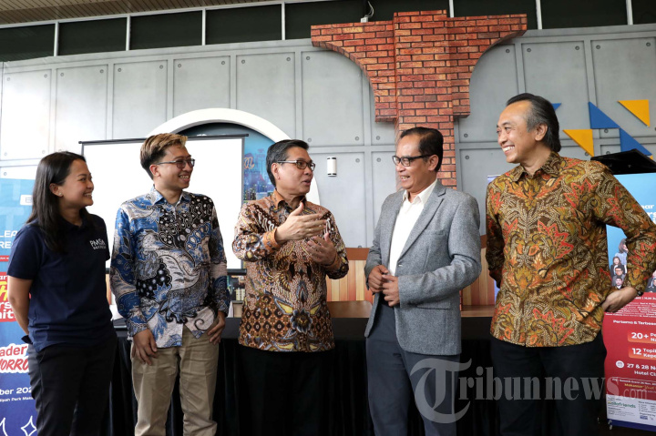Ketua PMSM Heriyanto Agung Putra (kanan) bersama Wakil ketua umum APINDO Sanny Iskandar (tengah), Ketua GNIK Yunus Triyonggo (kedua kanan), Ketua DPD PMSM Sulsel, ketua pelaksana Makassar Leadership Summit 2023 Disa Novianty (kiri), dan Ketua yayasan pemimpin.id Hendarsyah Aditya (kedua kiri) berbincang disela-sela konferensi pers penyelenggaraan Makassar Leadership Summit 2023 di Jakarta, Kamis (16/11/2023). Perhimpunan Manajemen Sumber Daya Manusia (PMSM), Gerakan Nasional Indonesia Kompeten (GNIK), Asosiasi Pengusaha Indonesia (APINDO), tiga lembaga berbasis sumber daya manusia (human resources/capital) dan berbasis kewirausahaan, berkolaborasi menyelenggarakan untuk pertama kalinya Makassar Leadership Summit 2023 yang dilaksanakan pada 27-28 November 2023 dan akan menghadirkan tokoh dan pemimpin nasional dari berbagai kalangan yang mengangkat tema Empowering and Shaping Future Leaders for a Transformative and Sustainable Indonesia. (TRIBUNNEWS/IRWAN RISMAWAN)