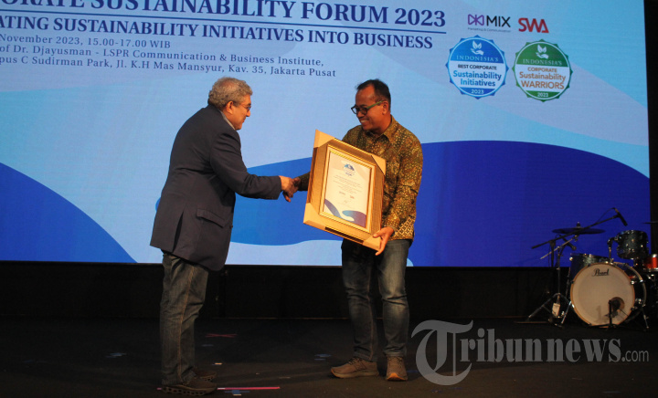 Sukaca Purwokardjono, Chief Marketing Officer Smartfren (kanan) saat mewakili penerimaan penghargaan Indonesia Corporate Sustainability Initiatives 2023 yang diselenggarakan oleh MIX MarComm, di Jakarta, Selasa (21/11/2023). Dalam ajang tersebut Smartfren meraih total 5 penghargaan sekaligus untuk "Gerakan 100% untuk Indonesia" dan berbagai program pemberdayaan sosial berkelanjutan terkait. Adapun penghargaan tersebut adalah Indonesia Best Corporate Sustainability Initiatives 2023, Indonesia Best Corporate Sustainability Warrior 2023, dan 3 penghargaan untuk Most Engaging Sustaiability Initiatives Program 2023. WARTA KOTA/ANGGA BHAGYA NUGRAHA