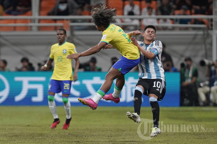 Pesepakbola Timnas Argentina, Claudio Echeverri (kanan) bertabrakan dengan pesepak bola Brasil pada babak delapan besar Piala Dunia U-17 di Jakarta International Stadium (JIS), Jumat (24/11/2023). Argentina sementara unggul 1-0 pada babak pertama. TRIBUNNEWS/HERUDIN