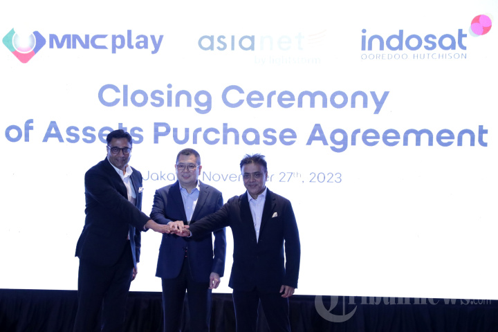 Executive Chairman of MNC Group Hary Tanoesoedibjo (tengah) berbincang dengan President Director and Chief Executive Officer of Indosat Ooredoo Hutchison Vikram Sinha (kiri) dan Group CEO & MD Lightstorm Amajit Gupta (kanan) disela-sela acara konferensi pers mengenai transaksi penjualan dan pengalihan atas sebagian aset jaringan fixed broadband (Aset MNC Play) dan khusus pelanggan Aset MNC Play kepada PT Asianet Media Teknologi dan PT Indosat Tbk. di Jakarta, Senin (27/11/2023). Hal ini menegaskan komitmen Indosat dalam menyediakan layanan internet rumah tangga unggulan kepada masyarakat luas sembari menambahkan layanan video entertainment yang disediakan oleh MNC Play dalam satu layanan. TRIBUNNEWS/IRWAN RISMAWAN