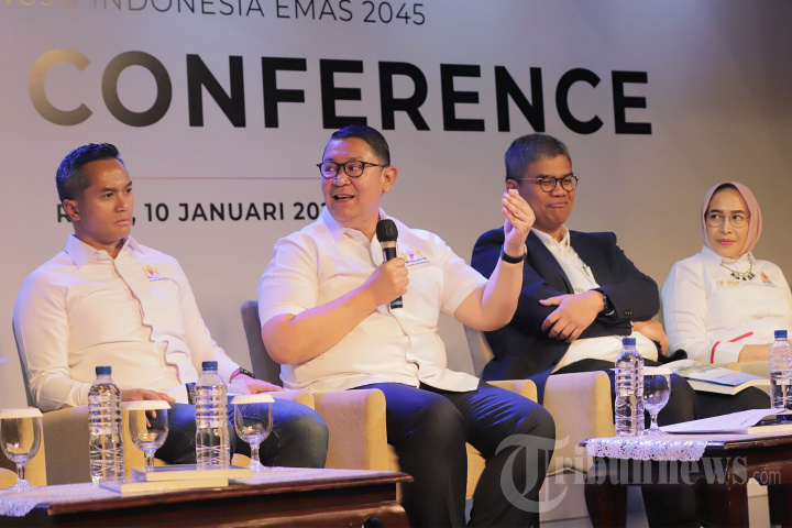 Ketua Dewan Pertimbangan Kadin Indonesia Anindya Bakrie, Plh Ketua Umum Kadin Indonesia, Yukki Nugrahawan Hanafi, Sekretaris Dewan Pakar Timnas Anies Baswedan - Muhaimin Iskandar Wijayanto Samirin dan Ketua Umum Kadin DKI Jakarta Diana Dewi menggelar konferensi pers Dialog Capres Bersama Kadin: Menuju Indonesia Emas 2045 di Jakarta, Rabu (10/1/2024). Kadin Indonesia berkolaborasi dengan Kadin DKI Jakarta akan menggelar Dialog Capres Bersama Kadin: Menuju Indonesia Emas 2045 pada Kamis 11 Januari 2024 yang bertujuan untuk meningkatkan pemahaman para pelaku usaha dan publik mengenai visi misi serta program ekonomi para pasangan capres/cawapres dalam mewujudkan Visi Indonesia Emas 2045. Tribunnews/Jeprima