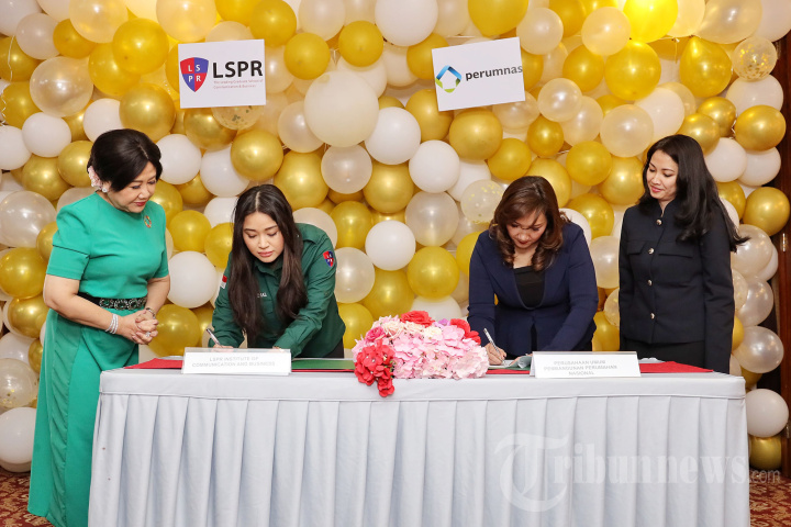 (Kiri ke kanan) Pendiri dan Pemilik LSPR Institute Prita Kemal Gani, Eksekutif Direktur LSPR Institute Ghina Amani Kemal Gani, Direktur Pemasaran Perum Perumnas Imelda Alini Pohan, Kepala Divisi Pemasaran Korporasi dan Digital Perum Perumnas Ari Kartika, saat penandatanganan kerjasama antara LSPR Institute dengan Perum Perumnas di Auditorium Kampus LSPR Sudirman Park, Jakarta, Senin (15/1/2024). LSPR Institute of Communication & Business secara resmi menandatangani nota kesepahaman dengan Perum Pembangunan Perumahan Nasional (Perum Perumnas) dalam memberikan solusi hunian impian untuk seluruh Civitas Academica LSPR, Komitmen ini bertujuan mewujudkan kesejahteraan tenaga pendidik dan mahasiswa dengan menawarkan hunian impian. Tribunnews/HO