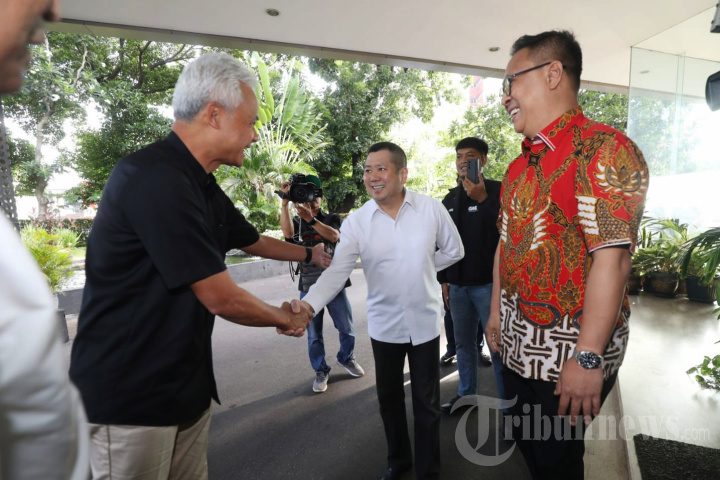 Calon presiden (capres) nomor urut 3, Ganjar Pranowo (kiri)didampingi oleh Ketua Umum DPP Partai Persatuan Indonesia (Perindo) Hary Tanoesoedibjo (tengah) saat mengunjungi Kantor Persekutuan Gereja-gereja di Indonesia (PGI) untuk berdialog denan pengurus PGI di Jakarta, Senin (22/1/2024). Ganjar memaparkan berbagai topik terkait kepemimpinan dan berbagai pengalamannya saat menjadi aktivis di era Reformasi 1998 hingga menjadi Gubernur Jawa Tengah dua periode pada 2013-2023. TRIBUNNEWS/HO