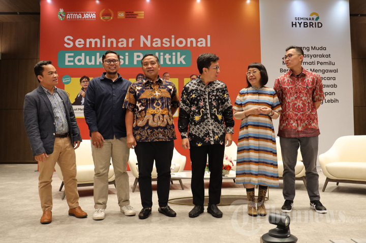 Dari kiri Salvatore Simarmata ( Dosen Fakultas Ilmu Administrasi Bisnis dan Ilmu Komunikasi Unika Atma Jaya), Vincentius Gitiyarko Priyatno (Peneliti Litbang Kompas), Cornelius Beny Juniarto (Praktisi Hukum), Prof. Dr. dr. Yuda Turana (Rektor Universitas Katolik Indonesia Atma Jaya), Elisabeth Kusrini (FORMAPPI), dan Muhammad Fajar (Research Fellow IFAR UAJ) saat Seminar Edukasi Politik di Unika Atmajaya Semanggi, Jakarta, Jumat (26/1/2024). Unika Atma Jaya selenggarakan Seminar Nasional Edukasi Politik Ajak Masyarakat Kawal Pemilu 2024, Menjelang pemilu tahun 2024, yang menjadi mercusuar demokrasi yang menerangi jalan menuju pemilih yang terinformasi dan terlibat. Dengan memberikan masyarakat informasi, pengetahuan, dan keterampilan berpikir kritis. Seminar Nasional ini berkontribusi terhadap proses demokrasi, memperkuat gagasan bahwa pemilih yang berpendidikan adalah landasan demokrasi yang berkembang. Tribunnews/HO