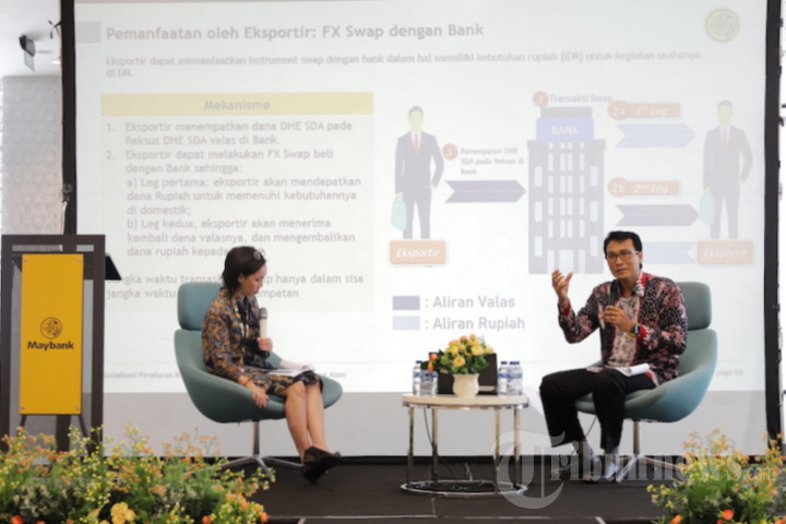 Head Global Markets & Corporate Treasury PT Bank Maybank Indonesia Tbk (Maybank Indonesia) I Made Budhi P Artha (kanan) memberikan sosialisasi Peraturan Bank Indonesia (PBI) Nomor 7 tahun 2023 tentang Devisa Hasil Ekspor (DHE) dan Devisa Pembayaran Impor di Jakarta, Rabu (6/3/2024). Sosialisasi ini dilaksanakan untuk memberikan penjelasan kembali kepada nasabah korporasi Maybank Indonesia mengenai peraturan baru terkait PBI DHE Sumber Daya Alam khususnya kewajiban yang harus dilakukan oleh nasabah, sejalan dengan misi Bank, Humanising Financial Services. Pada kesempatan yang sama, Maybank Indonesia juga menginformasikan program khusus untuk menarik minat para eksportir dalam menempatkan DHE SDA di rekening khusus. TRIBUNNEWS/IRWAN RISMAWAN