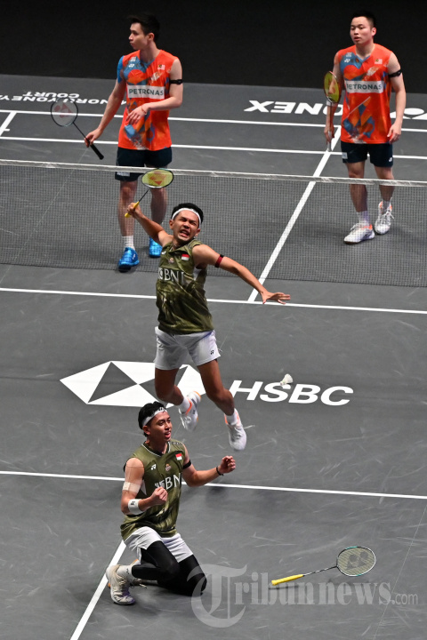 Fajar Alfian (tengah) dari Indonesia dan Muhammad Rian Ardianto (bawah) dari Indonesia merayakan kemenangan atas Aaron Chia dari Malaysia dan Soh Wooi Yik dari Malaysia di Final Ganda Putra di Kejuaraan Bulu Tangkis All England Open di Utilita Arena di Birmingham, Inggris tengah, pada 17 Maret 2024. (Photo by JUSTIN TALLIS / AFP)