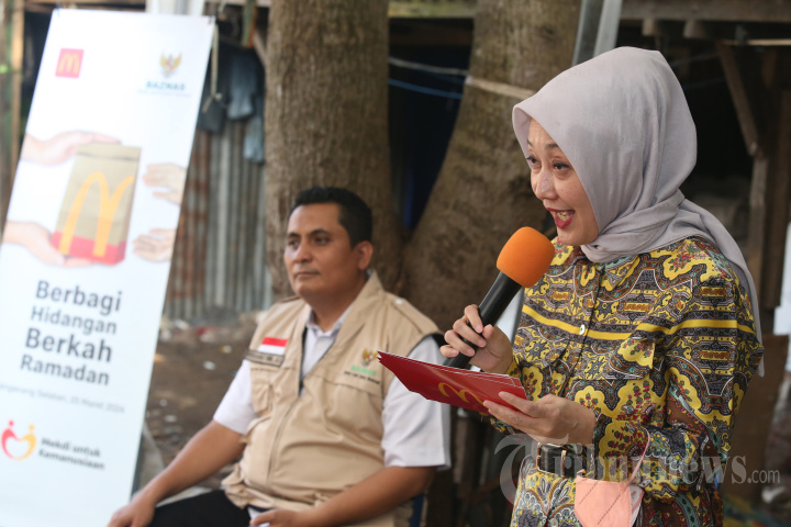 HR & GS Director PT Rekso Nasional Food Yulianti Hadena (kanan), dan Direktur Pengumpulan Perorangan BAZNAS RI Fitriansyah Agus Setiawan (kiri) menghadiri kegiatan ?Hidangan Berkah Ramadan' di Kampung Pemulung Pondok Aren, Tangerang Selatan, pada Senin (25/3/2024). Kegiatan ini dilakukan melalui ?Hidangan Berkah Ramadan?, suatu program rutin dari BAZNAS RI yang dilakukan setiap bulan Ramadan untuk berbagi paket bukaan atau sahur kepada masyarakat yang membutuhkan. Spesialnya, di tahun ini BAZNAS RI menggandeng McDonald?s Indonesia dalam program tersebut sebagai bentuk keberlanjutan dari kerja sama yang telah terjalin sejak awal tahun ini di bawah payung program ?Mekdi untuk Kemanusiaan?. TRIBUNNEWS/HO