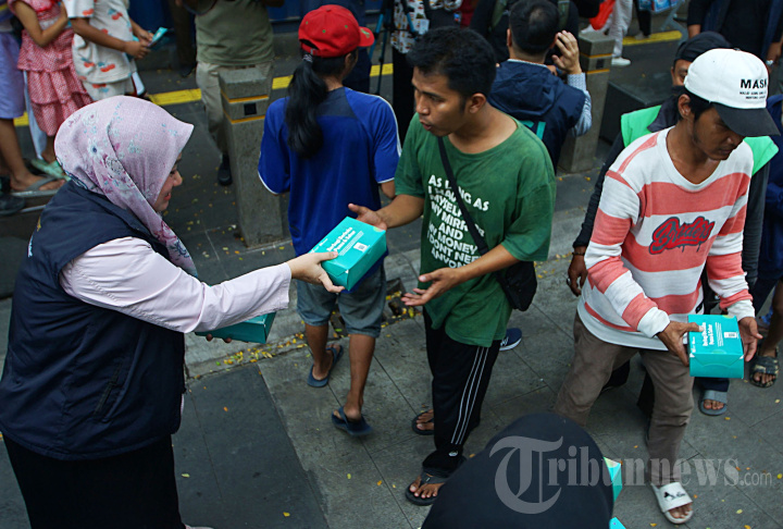 Tim BSI Maslahat membagikan Takjil dan paket buka puasa dalam kegiatan Social Activation kepada masyarakat sekitar dan para pejalan kaki di area Stasiun Sudirman, Jakarta Pusat, Selasa (26/3/2024). BSI Maslahat dan Bank BSI membagikan sebanyak 800 paket takjil dengan menggunakan Mobil Warteg Mobile. Diharapkan dengan pembagian takjil dan paket buka puasa ini mempermudah masyarakat yang ingin berbuka dalam perjalanan pulang ke tempat tujuan masing-masing baik yang menggunakan KRL ataupun moda transportasi lainnya. Tribunnews/Jeprima