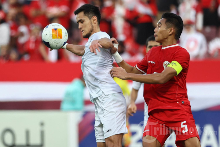 Bek Indonesia Rizky Ridho (kanan) menjaga penyerang Uzbekistan Ulugbek Khoshimov pada pertandingan semifinal Piala Asia U23 AFC Qatar 2024 antara Indonesia dan Uzbekistan di Stadion Abdullah Bin Khalifa di Doha pada 29 April 2024. (KARIM JAAFAR / AFP)
