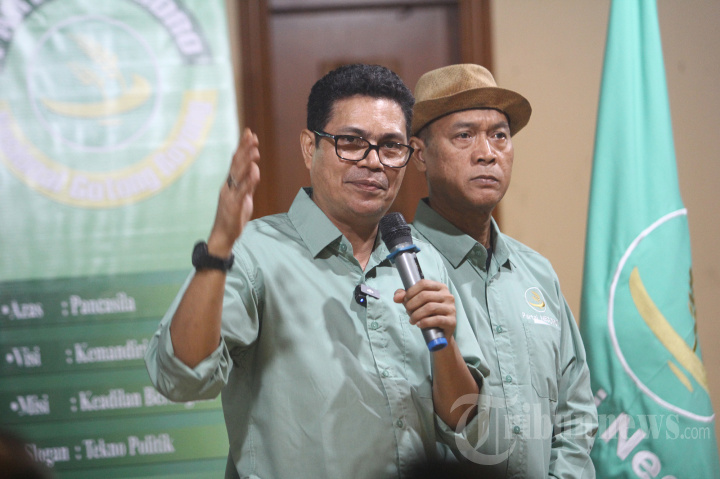 Inspirator Partai Negoro,  Faizal Assegaf (kiri), didampingi Sekjend Partai Negoro, Chairul Aminudin, memberikan orasi saat Peluncuran Partai Negoro di Jakarta, Minggu (12/05/2024).  Partai politik baru bernama Partai Nasional Gotong Royong (Negoro) Resmi Dideklarasikan, dengan mengusung politik terbarukan dan terbuka untuk rumah rakyat. WARTA KOTA/ANGGA BHAGYA NUGRAHA