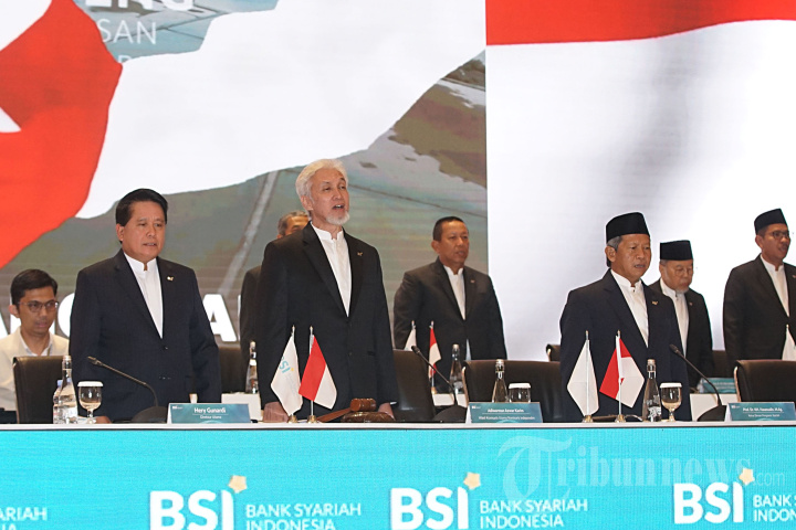 Direktur Utama BSI Hery Gunardi didampingi Wakil Direktur Utama BSI Bob Tyasika Ananta, Wakil Komisaris Utama/Independen BSI Adiwarman Azwar Karim dan Ketua Dewan Pengawas Syariah BSI Prof. Dr. KH. Hasanudin bersiap menggelar Rapat Umum Pemegang Saham Tahunan Tahun Buku 2023 PT Bank Syariah Indonesia Tbk di Jakarta, Jumat (17/5/2024). Berdasarkan hasil Rapat Umum Pemegang Saham Tahunan (RUPST). Hery Gunardi kembali ditetapkan sebagai Direktur Utama BSI dan menyatakan melanjutkan Transformasi setelah merger Tahun 2021. Tribunnews/Jeprima