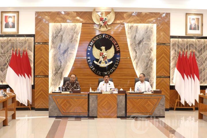 Menteri Koordinator Bidang Politik, Hukum dan Keamanan (Menko Polhukam) Hadi Tjahjanto (tengah) bersama Menteri Komunikasi dan Informatika (Menkokinfo) Budi Arie Setiadi (kiri) dan Kepala PPATK Van Yustiavandana (kanan) mengikuti rapat Satuan Tugas Pemberantasan Judi Online di Kantor Kemenko Polhukam, Jakarta, Rabu (19/6/2024). Rapat tersebut merupakan rapat perdana Satgas Pemberantasan Judi Online setelah dibentuk oleh Presiden Joko Widodo melalui Keputusan Presiden (Keppres) Nomor 21 Tahun 2004 untuk mendukung percepatan pemberantasan perjudian online secara terpadu. TRIBUNNEWS/IRWAN RISMAWAN