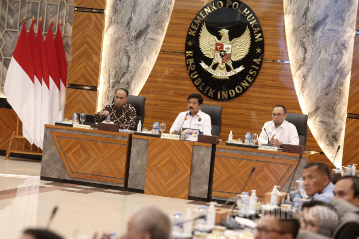 Menteri Koordinator Bidang Politik, Hukum dan Keamanan (Menko Polhukam) Hadi Tjahjanto (tengah) bersama Menteri Komunikasi dan Informatika (Menkokinfo) Budi Arie Setiadi (kiri) dan Kepala PPATK Van Yustiavandana (kanan) mengikuti rapat Satuan Tugas Pemberantasan Judi Online di Kantor Kemenko Polhukam, Jakarta, Rabu (19/6/2024). Rapat tersebut merupakan rapat perdana Satgas Pemberantasan Judi Online setelah dibentuk oleh Presiden Joko Widodo melalui Keputusan Presiden (Keppres) Nomor 21 Tahun 2004 untuk mendukung percepatan pemberantasan perjudian online secara terpadu. TRIBUNNEWS/IRWAN RISMAWAN