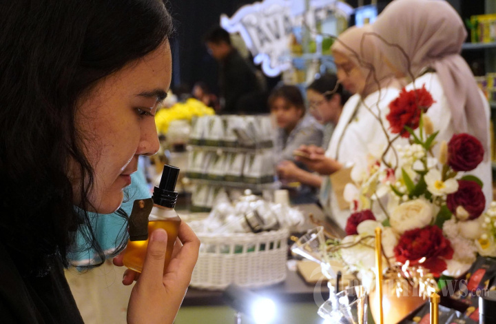 Pengunjung mencium pengharum ruangan yang terbuat dari teh di salah satu stan pada festival teh bertajuk Java Tea Experience (JTE) 2024 di Trans Convention Center, Kota Bandung, Jawa Barat, Jumat (28/6/2024). Pameran yang diikuti belasan produk teh dari pelaku UMKM tersebut juga dilengkapi dengan talkshow pengembangan bisnis artisan tea, ekspor teh dan tea class mixology. (TRIBUN JABAR/GANI KURNIAWAN)