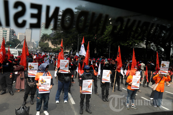 Sejumlah buruh menggelar aksi unjuk rasa di kawasan Patung Kuda, Jakarta, Rabu (3/7/2024). Mereka menuntut perusahaan menyetop PHK buruh tekstil serta pemerintah melindungi industri dalam negeri khususnya industri tekstil, kurir dan logistik, dan baja. TRIBUNNEWS/IRWAN RISMAWAN