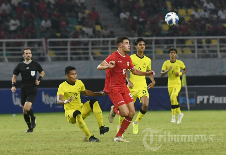 Pemain Timnas U-19 Indonesia Jens Raven (9) terkepung pemain Timnas Malaysia pada pertandingan semi final yang berlangsung di Stadion Gelora Bung Tomo (GBT) Surabaya, Sabtu (27/7/2024). Kemenangan 1-0 atas Malaysia ini mengantarkan Timnas Indonesia U-19 ke babak final dan akan berhadapan dengan Timnas Thailand sebagai pertandingan penutup Asean U-19 Boy's Championship 2024. SURYA/HABIBUR ROHMAN