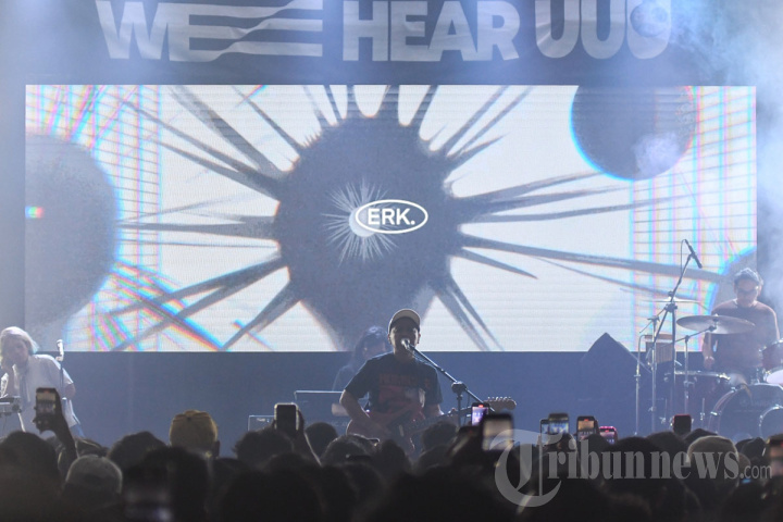 Grup band indie Efek Rumah Kaca (ERK) saat live concert bersama We Hear Uuu vol 4 di Malang Creative Center (MCC) Kota Malang, Jawa Timur, Kamis (5/9/2024) malam. Tidak hanya konser, gelaran tersebut juga mengangkat isu lingkungan dan mengajak audiens bertindak nyata dalam program penanaman bibit pohon. SURYA/PURWANTO