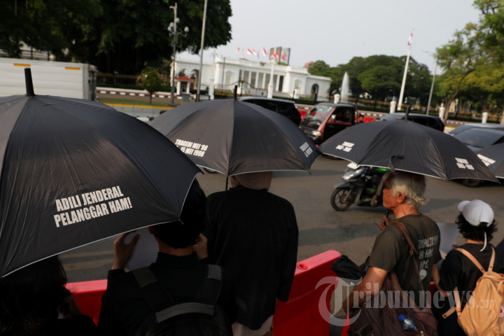 Aktivis Jaringan Solidaritas Korban untuk Keadilan (JSKK) menggelar aksi ke-837 di seberang Istana Merdeka, Jakarta, Kamis (17/10/2024). Aksi Kamisan ini merupakan aksi perdana di era Pemerintahan Prabowo-Gibran dan mengkritik pernyataan Menko Hukum dan Ham Yusril Ihza Mahendra yang nir empati terhadap korban pelanggaran berat HAM. TRIBUNNEWS/IRWAN RISMAWAN