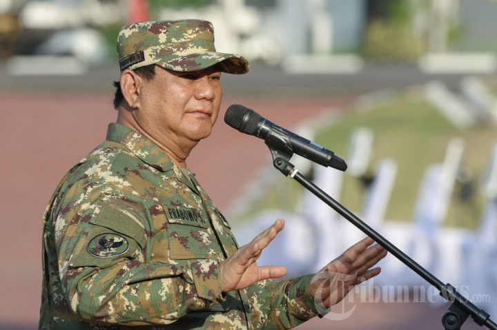 Gambar selebaran ini diambil dan dirilis pada tanggal 25 Oktober 2024 oleh Mitra Media resmi Partai Gerindra yang memperlihatkan Presiden Indonesia Prabowo Subianto berbicara selama kunjungan ke akademi militer di Magelang, Jawa Tengah. (Photo by Handout / Media Partner of Gerindra Party / AFP)