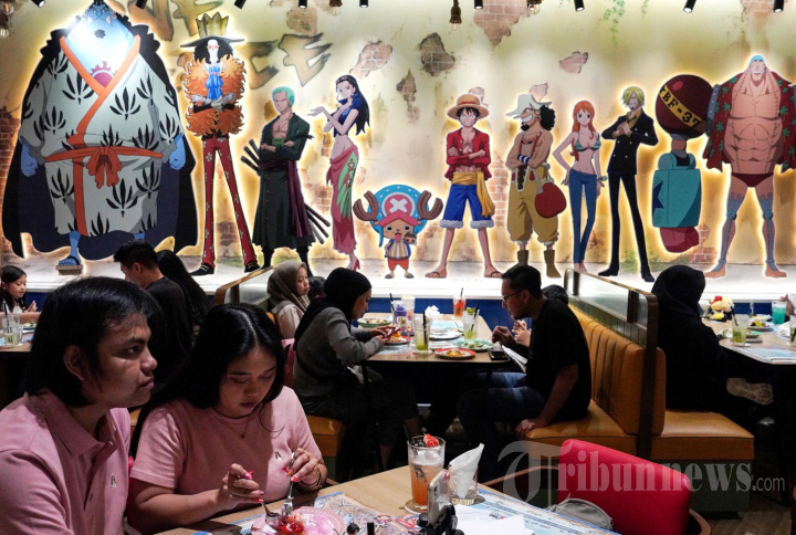 Pengunjung menikmati makanan saat pembukaan One Piece Cafe Indonesia di Senayan Park, Jakarta, Sabtu (23/11/2024). Senayan Park, pusat perbelanjaan yang berlokasi di jantung kota Jakarta, menjadi tuan rumah dari flagship pertama di Asia, One Piece Caf? Indonesia yang berasal dari pusat ekspansi IP (Intellectual Property) TOEI Animation yang memproduksi berbagai animasi populer, dan One Piece menjadi salah satu yang terkenal di seluruh dunia yang ditujukan sebagai bentuk dukungan komunitas dan penggemar One Piece yang terkenal dengan sebutan Nakama yang cukup kuat di Indonesia. One Piece dipastikan akan menghadirkan pengalaman tematik yang imersif bagi para penggemar, dengan menghidupkan dunia One Piece dengan sajian kuliner eksklusif serta atmosfer yang menggambarkan karakter dan cerita ikonik dari serial animasi yang cukup populer. TRIBUNNEWS/IRWAN RISMAWAN