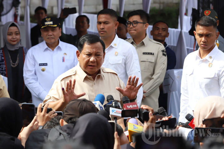 Presiden RI Prabowo Subianto memberikan pernyataan kepada awak media usai gunakan hak pilihnya pada Pilkada 2024 di TPS 08 Desa Bojong Koneng, Jawa Barat, Rabu (27/11/2024). Pantauan Tribunnews.com Prabowo Subianto tiba di lokasi sekitar pukul 08.45 WIB mengenakan kemeja safari berwarna cokelat dan celana hitam dengan pengawalan dari Paspampres Prabowo mengapresiasi penyelengaraan Pilkada 2024, menurutnya Indonesia kini sudah memiliki sistem yang baik karena telah melaksanakan pemilu langsung berkali-kali. Tribunnews/Jeprima