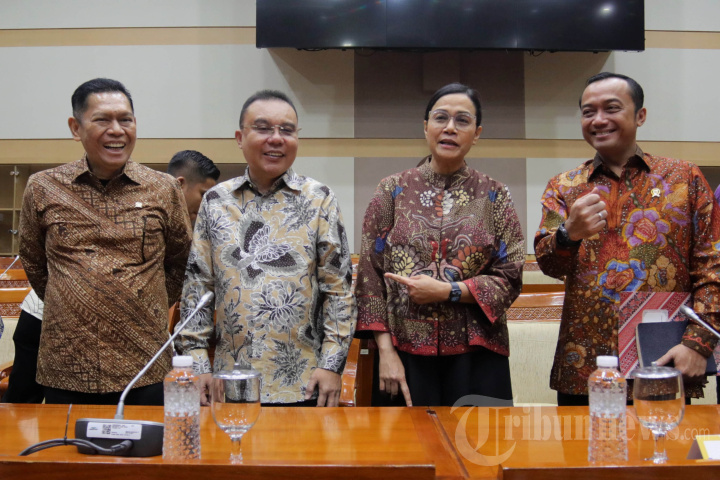 KETERANGAN EFISIENSI ANGGARAN - Menteri Keuangan Sri Mulyani Indrawati (kedua kanan) bersama Wakil Ketua DPR Sufmi Dasco Ahmad (kedua kiri), Mensesneg Prasetyo Hadi (kanan) dan Wakil Ketua DPR Adies Kadir (kiri) usai memberikan keterangan pers terkait efisiensi anggaran di lingkungan Kementerian/Lembaga di Komisi III DPR, Kompleks Parlemen, Senayan, Jakarta, Jumat (14/2/2025). Dalam keterangan pers tersebut Sri Mulyani menyampaikan bahwa tidak ada pemutusan hubungan kerja (PHK) tenaga kerja honorer di lingkungan Kementerian dan Lembaga. TRIBUNNEWS/IRWAN RISMAWAN