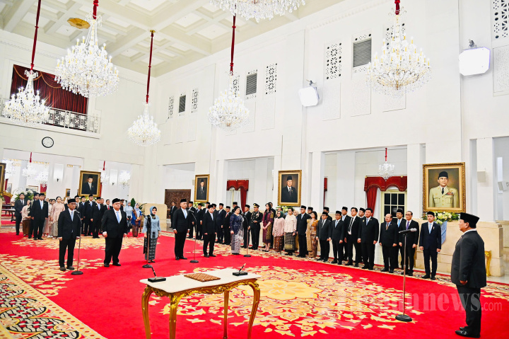 RESHUFFLE KABINET-Suasana pelantikan Guru Besar ITB Brian Yuliarto menjadi Menteri Pendidikan Tinggi, Sains, dan Teknologi (Mendiktisaintek) oleh Presiden Prabowo Subianto di Istana Negara, Jakarta, Rabu (19/2/2025). Presiden Prabowo Subianto melantik Brian Yuliarto sebagai Mendiktisaintek menggantikan Satryo Soemantri Brodjonegoro. TRIBUNNEWS/SETPRES/LAILY RACHEV