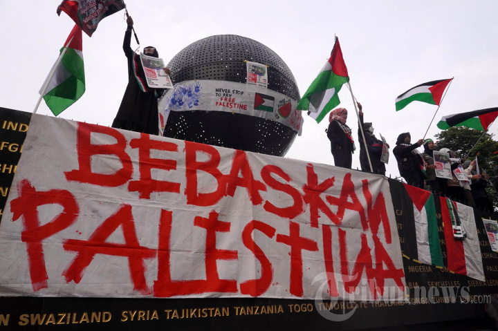 Seniman pantomim, Wanggie bersama Mujahidah Sahabat Palestina menggelar aksi Solidaritas Seni untuk Palestina di Monumen Solidaritas Asia-Afrika, Jalan Asia Afrika, Kota Bandung, Jawa Barat, Senin (9/6/2025). Mereka menyerukan tiga poin tuntutan, yakni bebaskan 12 aktivis Freedom Flotilla's Madleen yang ditangkap pihak keamanan Israel, buka blokade bantuan kemanusiaan, dan hentikan genosida warga Palestina di Gaza. (TRIBUN JABAR/GANI KURNIAWAN)