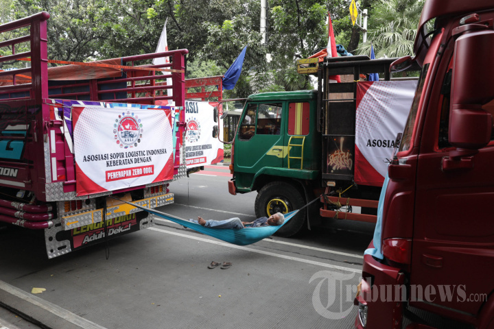 DEMO PENGEMUDI TRUK - Pengemudi truk melakukan aksi damai soal nol kelebihan muatan atau zero over dimensi over loading (ODOL) di Jalan Medan Merdeka Selatan, Jakarta, Rabu (2/7/2025). Aksi yang dilakukan oleh Rumah Berdaya Pengemudi Indonesia (RBPI) dan Asosiasi Sopir Logistic Indonesia tersebut menuntut pemerintah mengkaji kembali RUU nol kelebihan muatan dan dimensi atau zero over dimensi over loading. TRIBUNNEWS/IRWAN RISMAWAN
