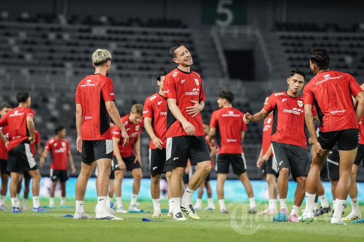 LATIHAN - Pesepak bola Timnas Indonesia, Thom Haye (tengah) tertawa di tengah sesi latihan di Stadion Gelora Bung Tomo, Surabaya pada Kamis (4/9/2025) malam. Sesi ini bagian dari persiapan Timnas Indonesia jelang menghadapi China Taipei dalam agenda FIFA Matchday. Tribun Solo/Muhammad Nursina