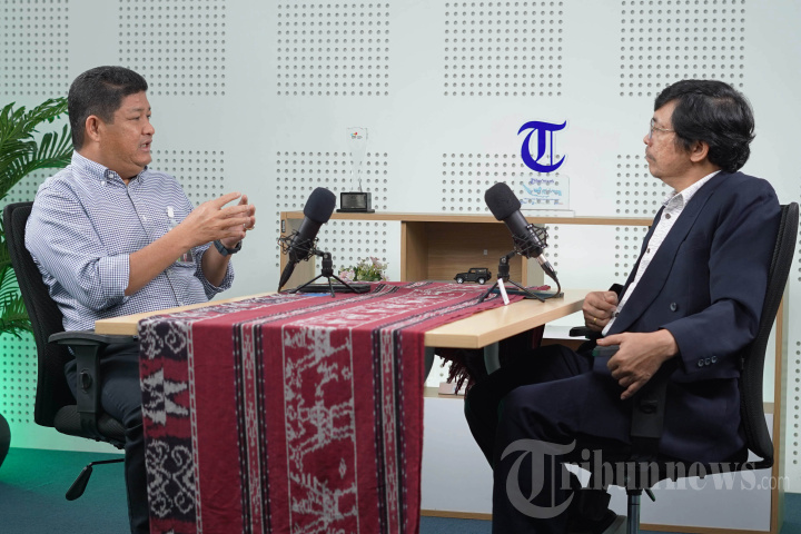 WAWANCARA KHUSUS - Direktur Perencanaan Strategis & Teknologi Informasi BPJS Ketenagakerjaan Zainudin (kiri) memberikan keterangan mengenai beberapa manfaat menjadi peserta BPJS Ketenagakerjaan kepada Wakil Direktur Pemberitaan Tribun Network Domu Ambarita (kanan) di Studio Tribun Network, Jalan Palmerah Selatan, Jakarta Pusat, Rabu (8/10/2025). Satu di antara manfaat menjadi peserta BPJS Ketenagakerjaan tersebut, yaitu mendapatkan beasiswa S1. TRIBUNNEWS/LENDY RAMADHAN