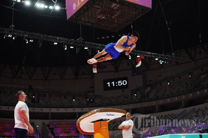 SESI LATIHAN - Atlet senam dunia melakukan latihan perdana sekaligus uji coba lapangan di Indonesia Arena komplek Gelora Bung Karno (GBK) Jakarta, Kamis (16/10/2025). Sejumlah atlet senam mulai menggelar sesi latihan menjelang Kejuaraan Dunia Senam Artistik FIG ke-53 2025 pada 19-25 Oktober 2025 di Indonesia Arena. TRIBUNNEWS/HERUDIN