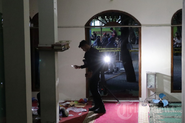 TKP LEDAKAN - Tim Puslabfor Bareskrim Polri melakukan olah tempat kejadian perkara (TKP) ledakan di SMA Negeri 72 Jakarta, Jumat (7/11/2025). Ledakan yang berasal dari sekitar Masjid SMA Negeri 72 Jakarta tersebut menyebabkan korban luka mencapai 54 orang dan Tim gabungan dari TNI, Polri dan Gegana masih melakukan penyelidikan dan penyisiran di area tersebut.TRIBUNNEWS/IRWAN RISMAWAN