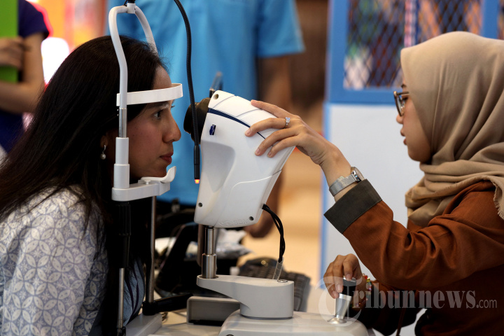 KAMPANYE MATA SEHAT - Pengunjung diperiksa matanya disela-sela konferensi pers INSTO Dry Eyes meluncurkan kampanye 'Bebas Mata SePeLe' di Jakarta (7/11/2025). INSTO, merek tetes mata dari Combiphar, melalui produk INSTO Dry Eyes meluncurkan kampanye 'Bebas Mata SePeLe' untuk meningkatkan kesadaran masyarakat tentang mata SEpet, PErih, LElah (SePeLe) yang merupakan gejala mata kering. Kampanye ini, bertujuan untuk meningkatkan kesadaran masyarakat sekaligus menghadirkan solusi yang sesuai kebutuhan, agar masyarakat Indonesia dapat menjaga kesehatan mata dan tetap produktif. TRIBUNNEWS/IRWAN RISMAWAN