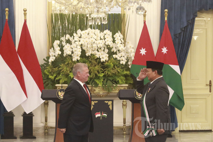 KUNJUNGAN KENEGARAAN - Presiden Prabowo Subianto memberikan salam hormat kepada Raja Kerajaan Yordania Hasyimiah Abdullah II Ibnu Al Hussein saat kunjungan kenegaraan di Istana Merdeka, Jakarta, Jumat (14/11/2025). Kunjungan Raja Yordania tersebut dalam rangka memperkuat hubungan bilateral dan kerja sama strategis antara Indonesia dan Yordania. Tribunnews/Jeprima