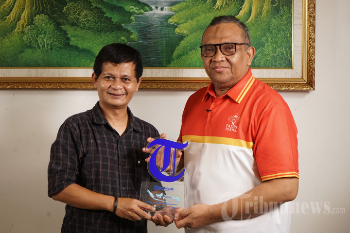 WAWANCARA KHUSUS - Wakil Menteri Ketenagakerjaan Afriansyah Noor (kanan) menerima cinderamata yang diserahkan oleh News Manager Tribun Network Rachmat Hidayat seusai wawancara khusus dengan Tribun Network di kawasan Duri Kosambi, Jakarta Barat, Sabtu (22/11/2025). Dalam kesempatan itu, Afriansyah Noor menjelaskan sejumlah program Kementerian Ketenagakerjaan, di antaranya program magang nasional hingga persoalan perburuhan yang menyangkut upah minimum. TRIBUNNEWS/IMANUEL NICOLAS MANAFE