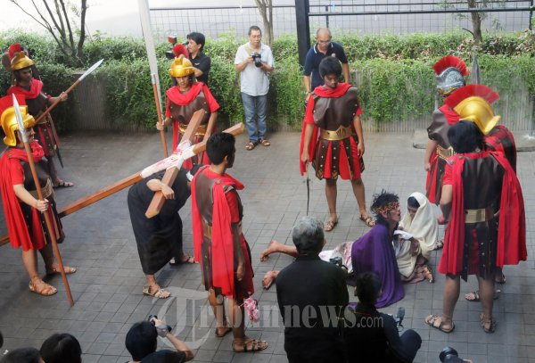 KISAH SENGSARA YESUS KRISTUS DI KAYU SALIB - Muda mudi katholik Keluarga Besar Paroki Gereja Santa Maria Regina (SANMARE) tergabung dalam Bina Iman Remaja (BIR) dan Orang Muda Katholik (OMK) melakukan drama visualisasi prosesi penyaliban Yesus, Jumat (31/3/2013) di Gereja Sanmare, Bintaro Jaya, Tangerang, Benten. Prosesi tersebut merupakan bagian dari perayaan Jumat Agung yang mengisahkan kesengsaraan Yesus Kristus untuk menebus dosa manusia dan merupakan bagian dari ibadah Paskah. Drama ini disutradarai oleh Daniel H Jacob dan penulis naskah Ariobimo Nusantara. (TRIBUNNEWS.COM/FX ISMANTO)