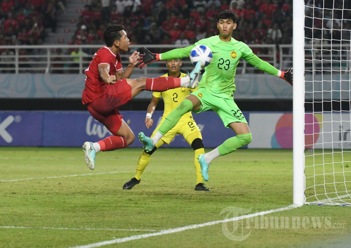 Pemain Timnas U-19 Indonesia M Alfharezzi (kiri) berhadapan dengan kiper Timnas Malaysia M Haziq Aiman (kanan) pada pertandingan semi final yang berlangsung di Stadion Gelora Bung Tomo (GBT) Surabaya, Sabtu (27/7/2024). Kemenangan 1-0 atas Malaysia ini mengantarkan Timnas Indonesia U-19 ke babak final dan akan berhadapan dengan Timnas Thailand sebagai pertandingan penutup Asean U-19 Boy's Championship 2024. SURYA/HABIBUR ROHMAN