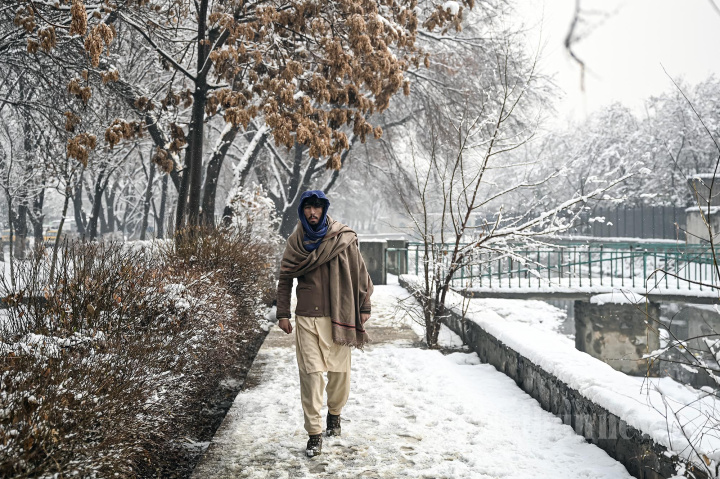 Seorang pria berjalan di taman setelah hujan salju lebat di Kabul. Rabu (5/1/2022). Salju musim dingin mulai mengguyur sebagian wilayah di Afghanistan. Turunnya salju di Kabul disambut antusias oleh pemuda dan anak-anak. Bahkan ada beberapa kecelakaan lalu lintas juga terjadi akibat hujan salju. (MOHD RASFAN/AFP)