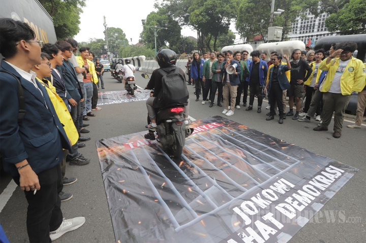 Sejumlah Mahasiswa yang tergabung dalam BEM SI menggelar aksi unjuk rasa didepan gedung Komisi Pemilihan Umum (KPU), Jakarta Pusat, Jumat (9/2/2024). Massa aksi membawa baliho bergambarkan Joko Widodo yang digelar di jalan. Mereka menyuarakan kritiknya kepada Presiden Joko Widodo (Jokowi) terkait demokrasi yang terdegradasi menjelang Pemilu 2024. Tribunnews/Jeprima