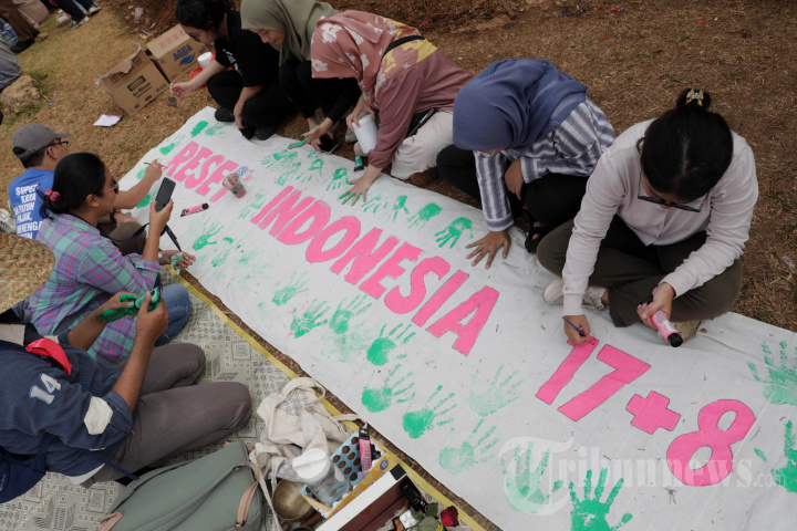 PENUHI TUNTUTAN - Sejumlah Mahasiswa dari Badan Eksekutif Mahasiswa Universitas Padjajaran bersama Masyarakat Sipil melakukan aksi damai di depan Kompleks Parlemen, Senayan, Jakarta, Jumat (5/9/2025). Dalam aksinya mereka menuntut Pemerintah dan DPR memenuhi 17+8 tuntutan rakyat yang merupakan rangkuman atas berbagai desakan yang beredar di media sosial sejak ramainyagelombang demonstrasi. TRIBUNNEWS/IRWAN RISMAWAN