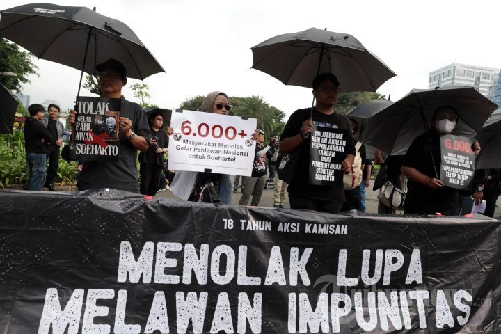 AKSI KAMISAN - Aktivis Jaringan Solidaritas Korban untuk Keadilan mengikuti aksi Kamisan ke-861 di depan Istana Merdeka, Jakarta, Kamis (15/5/2025). Dalam aksi tersebut menuntut penuntasan pelanggaram berat Hak Asasi Manusia (HAM) yang terjadi pada 12 Mei 1998 menolak pemberian gelar pahlawan kepada Presiden ke-2 RI Soeharto karena dinilai memiliki rekam jejak yang kelam. TRIBUNNEWS/IRWAN RISMAWAN