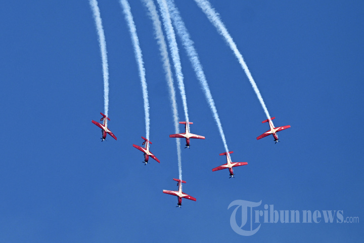 Tim Aerobatik Jupiter Angkatan Udara Indonesia tampil selama Bali International Airshow di Bandara Internasional Ngurah Rai dekat Denpasar di pulau resor Bali pada tanggal 18 September 2024. (Photo by SONNY TUMBELAKA / AFP)