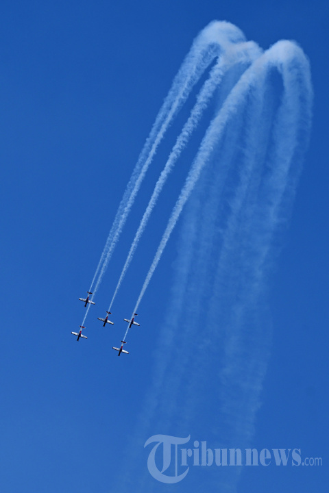 Tim Aerobatik Jupiter Angkatan Udara Indonesia tampil selama Bali International Airshow di Bandara Internasional Ngurah Rai dekat Denpasar di pulau resor Bali pada tanggal 18 September 2024. (Photo by SONNY TUMBELAKA / AFP)