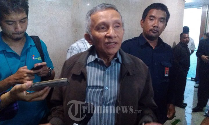 Ketua Majelis Pertimbangan PAN Amien Rais, menjawab pertanyaan wartawan disela usai mengikuti Sidang Paripurna Pemilihan Pimpinan MPR, di Gedung DPR, Jakarta, Senin (6/10/2014). Tribunnews.com/Ferdinand Waskita